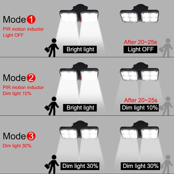3 modos de iluminación: Las luces del sensor de movimiento solar inalámbrico tienen 3 modos de iluminación: modo 1 (modo sensor): la luz se enciende cuando detecta movimientos y se apaga 20 segundos después de que la persona se va.