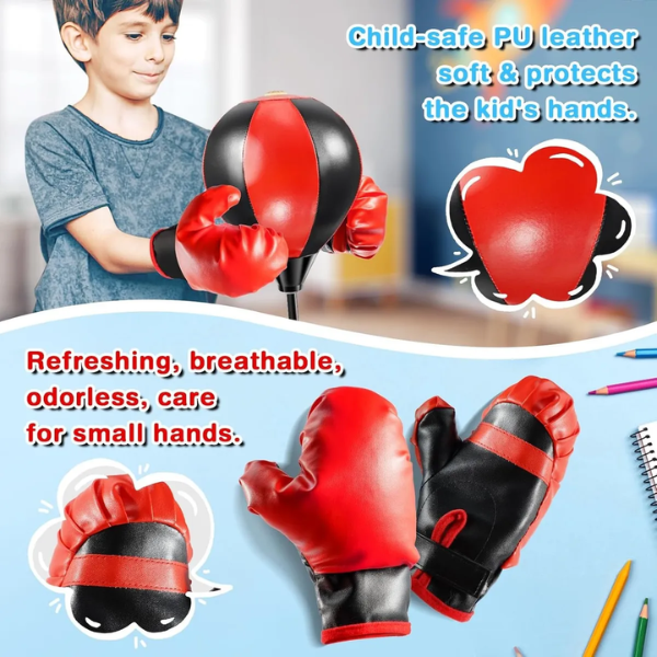 Juguete seguro para niños: el saco de boxeo para niños está hecho de cuero sintético de alta calidad. Los guantes están rellenos de algodón PP grueso, que es transpirable, suave y protege las manos de los niños. Los padres pueden sentirse seguros de dárselo a sus hijos como regalo del Día del Niño/Cumpleaños/Navidad.